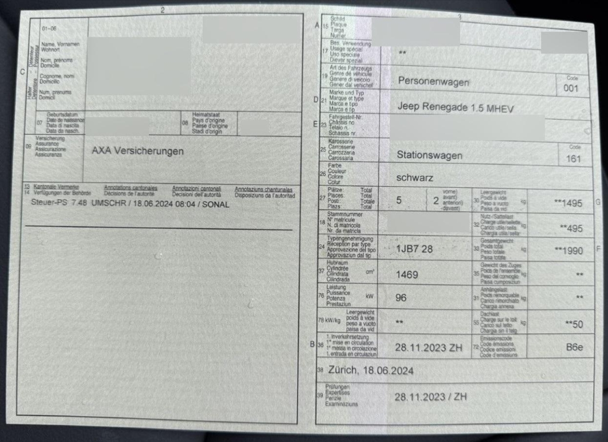 | Fahrzeugausweis | Vorhanden |
