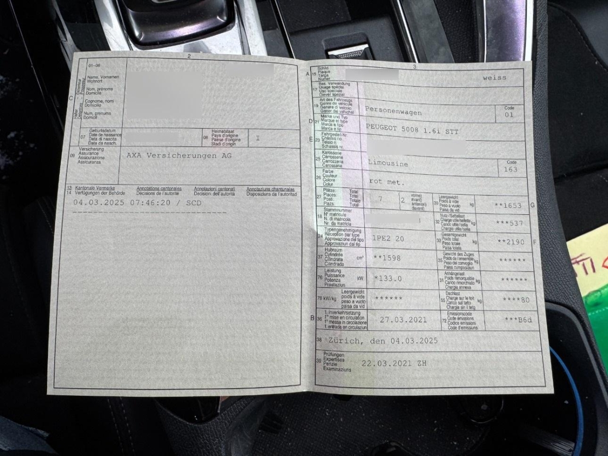 Katalysator geregelt, Licht: Drittes Bremslicht, Befestigungen für drei Kindersitze - nach der Norm ISOFIX am Beifahrersitz vorn und den hinteren seitlichen Plätzen, Media: Hi-Fi-System Premium FOCAL - Französischer Akustikkomfort, Verstauungsklappe auf Fusshöhe der Passagiere in der zweiten Reihe 2x, Media: Dual-USB-Anschluss für die Passagiere der Rückbank, Assist: Visuelle und akustische Einparkhilfe hinten, Kindersicherung an den hinteren Fenstern, Antiblockiersystem (ABS) mit elektronischem Bremskraftverteiler (EBV) und Notbremsassistent (AFU), Räder: 19-Zoll-Alufelgen San Francisco zweifarbig, glanzgedreht Schwarz Onyx mat mit Michelin 'Slimline' Reifen, LED-Innenbeleuchtung: Deckenleuchten (Staufächer auf GT), Geräuschdämmende Frontfenster, Fensterhebersteuerungen mit Chromeinlagen, Licht: Nebelschlussleuchte, Airbag: Vorhangairbags vorne und hinten, Beheizbare Heckscheibe mit aufgedruckten Antennen, Paket: Paket Safety, Dekor: Armaturentafel mit Ziernähten, Media: 12V-Anschlüsse (x3: Anschlussbereich, Rückseite der Konsole und Kofferraum), Sitze: Drei unabhängige, verschiebbare, verstellbare und im Boden einziehbare Sitze für Fahrgäste der zweiten Reihe, Fahrwerk: Driver Sport Pack: satterer, sportlicherer Motorsound, schärferes Ansprechverhalten des Gaspedals, sportlichere Servolenkung, Sport-Schaltung. Anzeige der Fahrzeugparameter im Head-up-Digitalinstrument möglich, Drehzahlmesser, Dynamische Stabilitätskontrolle (ESP) mit elektronischer Antriebsschlupfregelung (ARS), Dekor: Armaturentafel-Dekors und Türverkleidunge Alcantara Grau Greval, Edelstahlzierleisten an den Schutzvorrichtungen im unteren Türbereich, Elektrisch verstell- und beheizbare Aussenspiegel, Licht: PEUGEOT Full LED Technology - Scheinwerfer mit automatischer Leuchtweiteregelung - Statisches Kurvenlicht - Nebelmodus und erweiterte LED-Tagfahrleuchten in den Scheinwerfern, GT-Kühlergrill mit aufrüstbarem Chromdesign, Verchromter Schachbrett-Kühlergrill, Räder: Reifenreparaturset: 12-Volt-Kompressor, Flasche mit Dichtmittel, Abschleppöse, zwei Radkeile, Kurbel für elektrische Parkbremse, Aussenspiegelgehäuse in Schwarz Perla Nera, Dekor: Umrandung der Seitenfenster aus Edelstahl, Polster: Alcantara-/Kunstleder-Ausstattung, Assist: ABS, EBD, elektronische Bremskraftverteilung, Sitze: Vordersitze heizbar, Sitze: 2 Einzelsitze in der 3. Reihe, zusammenklappbar und herausnehmbar, Navigationssystem mit Sprachsteuerung, Paket: Paket Sicht, Beleuchtete Schminkspiegel, Garantie: 3 Jahre Garantie auf Teile, Arbeit und Peugeot Assistance - 3 Jahre / 80'000 km Garantie auf Teile, Arbeit und Peugeot Assistenz (je nachdem, welche Bedingung zuerst eintritt) - ausser Verschleissteile - 12 Jahre Korrosionsschutzgarantie - 3 Jahre Lackgarantie, Airbag: Seitenairbags auf der Fahrer- und Beifahrerseite vorn, Ganganzeige empfohlen, Räder: Indirekte Reifenluftdruckkontrolle, Lenkrad: Lenksäule in Höhe und Tiefe einstellbar, Media: Mirror Screen Funktion (Apple Carplay/Android Auto), Getriebe: 8-Stufen-Automat sequentiell, Paket: Paket Safety Plus, Verchromte Toggle Switches (Klaviertasten zur Aktivierung der Funktionen des Touchscreens), Stilistische Auspuffendrohre, verchromt, Fahrwerk: Drive Mode : Auswahl von 2 Fahrmodi (Eco oder Sport), Heckscheibenwischer mit automatischer Aktivierung beim Einlegen des Rückwärtsgangs, Peugeot i-Cockpit: digitales Head-up-Instrument mit hoher Anzeigequalität, kapazitiver 10-Zoll-Touchscreen und kompaktes Multifunktions-Lenkrad, Edelstahlzierleisten am Dachbogen, Rahmenloser lichtempfindlicher Innenspiegel, Lackierung: Metallic-Lackierung Metallic Copper, Scheibenwischer vorn mit Waschanlage Magic Wash, Dachreling aus Aluminium, Media: USB-Anschluss (im Anschlussbereich), Fahrzeitalarm, Lackierung: Dach Black Diamond (Dach Schwarz Perla Nera), Dekor: Vordere Kotflügeleinsätze verchromt, Klima: Zweizonen-Klimaautomatik mit Belüftungsdüsen im Fond, Elektrisch einklappbare Aussenspiegel mit LED-Coming-Home-Beleuchtung, Sitze: Beifahrersitz umklappbar, Schlüsselloses Zugangs- und Startsystem, Pedale und Fuss-Stütze in Aluminium, Lenkrad: Perforiertes Naturlederlenkrad mit verchromten Ringen und GT-Schriftzug, Wegfahrsperre elektronisch, Automatische Türverriegelung während der Fahrt, Dekor: Stossfängerblende hinten verchromt, Angesetzte schwarze Radkästen, Media: PEUGEOT Connect SOS & Assistance - Automatischer oder manueller Notruf über SOS-Taste und direkte Verbindung mit PEUGEOT Assistance (täglich rund um die Uhr), Höhenverstellbare 3-Punkt-Sicherheitsgurte vorn mit Aufrollvorrichtung mit Gurtstraffern und Gurtkraftbegrenzung, Assist: Erweiterte Erkennung von Verkehrszeichen (Stop, Einfahrtverbot, ...) und Geschwindigkeitsempfehlung, Paket: Ambienbeleuchtung - Vordere Deckenleuchte mit LED-Ambientbeleuchtung - LED-Beleuchtung in den Fussräumen und Türstaufächern vorn und in den Getränkehalter vorn, Airbag: Adaptive Frontairbags auf der Fahrer- und Beifahrerseite (auf der Beifahrerseite mit Schlüssel deaktivierbar), Elektrische Fensterheber vorn und hinten mit Impulssteuerung und Einklemmschutz, Kofferraumboden mit zwei Positionen, Deckenleuchte vorn mit Leselampen (x2) und Deckenleuchte (x2), Elektrische Parkbremse mit Berganfahrhilfe, Elektronisches Stabilitäts-Programm (ESP), Dekor: Edelstahltürschwellen vorn, Assist: Spurassistent, Innenraum und Dachhimmel Schwarz Mistral, Dekor: Innendekoration(Leisten an Armaturentafel und Türverkleidungen, Konsolenzierleiste) verchromt, Media: Radio mit DAB - bi-tuner MP3-kompatibel, und Bluetooth-Konnektivität (Audiostreaming, Freisprecheinrichtung) - Bedienelemente am Lenkrad - 6 Lautsprecher - 10-Zoll kapazitiver Touchscreen, Assist: Geschwindigkeitsregler/-begrenzer, 3-Punkt-Sicherheitsgurte - hinten mit Aufrollvorrichtung (x3), Gurtstraffern und Gurtkraftbegrenzung auf den seitlichen Plätzen, Schlüssellos bedienbare Heckklappe, Elektrische Servolenkung, Fussmatten vorn/hinten, Getönte hintere 