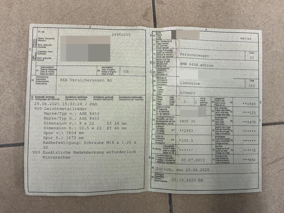 Aussenspiegel rechts und links beheizt und elektrisch verstellbar, asphärisch gewölbtes Spiegelglas, Reifenkontrollanzeige, Park Distance Control vorne und hinten, Servotronic, Tempomat, Intelligenter Notruf, 8-Stufen-Automat sequentiell, 2-Zonen-Klimaautomatik, Sonnenblende links, Partikelfilter und Oxydationskatalysator, Lenksäule elektrisch einstellbar mit Memory, Sonnenblende rechts, Assist: Auto-Hold-Funktion, Assist: Cornering Brake Control (CBC), Allradantrieb permanent, Verbandskasten, ISOFIX Kindersitzvorrichtung, Motor Start-/Stop-Anlage, Elektrische Lenkung (EPS), Abschliessbare Radschrauben, Scheibenwischer vorne mit Regensensor und automatischem Einschalten der Abblendlichter, Seitenairbags, Nichtraucherausführung, Elektronische Parkbremse, Check-Control-System, Airbag: Airbag Fahrer und Beifahrer, Leichtmetallfelgen im V-Speiche 236, 17J, Steckdose 12V, Heckscheibenheizung, Wegfahrsperre elektronisch, Aktive Kopfstützen, Window-Kopfairbags, Rücksitzlehne geteilt abklappbar, Licht: Leuchtweitenregulierung automatisch, Bordcomputer, Start-/Stop-Knopf, Scheibenwaschdüsen beheizt, TeleService, Dynamische Stabilitätskontrolle (DSC), Licht: Ambientes Licht, Aux-In Anschluss, Assist: Crash-Sensor, HiFi Lautsprechersystem, Vordersitze heizbar, Radio BMW Professional, Reifen mit Notlaufeigenschaft, Drittes Bremslicht, Weisse Blinkleuchten, Vordersitze elektrisch verstellbar mit Memory, Assist: Dynamische Traktionskontrolle (DTC), Sport-Lederlenkrad, Bi-Xenon-Scheinwerfer inkl. Reinigungsanlage, Licht: Nebelschlussleuchte, Veloursfussmatten vorne und hinten, Dynamische Bremsleuchten, Exterieurumfänge in Wagenfarbe, Aussenspiegel in Wagenfarbe, Kopfstützen hinten, Lackierung: Uni-Lackierung, Bremsassistent (BAS), Bremsbelag-Verschleissanzeige, Leder-Ausstattung Dakota, Zentralverriegelung mit Fernbedienung, Aussentemperaturanzeige, Einstiegsschienen, Bremsenergie-Rückgewinnung, Antiblockiersystem (ABS)