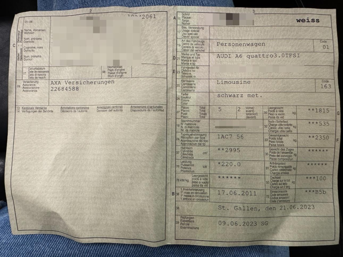Sitze: Vordersitze heizbar, Nebelscheinwerfer, Aussentemperaturanzeige, Start-/Stop-Knopf, Aussenspiegel rechts und links beheizt und elektrisch verstellbar, asphärisch gewölbtes Spiegelglas, Audi drive select, Ablagen in den Türen, Kartentaschen an den Rückenlehnen, Ausstiegsleuchten in den Türen vorn, Tageskilometerzähler, Digital Uhr, Instrumentenbeleuchtung, regelbar, Antriebsschlupfregelung (ASR), Drehzahlmesser, Elektronisches Stabilitäts-Programm (ESP), Lichtsensor, Wegfahrsperre elektronisch, 3-Punkt-Sicherheitsgurte auf allen Plätzen, Steckdose im Kofferraum, Lenkrad: Lenkrad längs- und höhenverstellbar, LED Blinker im Aussenspiegel, Airbag: Airbag Fahrer und Beifahrer, Garantie: 2 Jahre ohne Kilometerbegrenzung (ab 1. Inv.), Elektronische Parkbremse, Anfahrassistent, Sicherheitslenksäule, Kindersicherung an den hinteren Türen, Sitze: Vordersitze manuell verstellbar, Beide Make up-Spiegel beleuchtet, Schublade unter Beifahrersitz, Getönte Scheiben, Stop/Start-Technologie, ABS, EBD elektronische Bremskraftverteilung, Elektrische Fensterheber vorne + hinten, Kreuzstützen für Vordersitze elektrisch verstellbar, Media: MMI Radio plus, Scheinwerfer-Waschanlage, Seitenaufprall-Schutzsystem, MMI basic, Media: Audi Sound System, Lackierung: Uni-Lackierung, Schublade unter Fahrersitz, Wassertemperaturanzeige, Licht: Halogenscheinwerfer, Wagenheber, Licht: Tagfahrlicht, Katalysator geregelt, Wartungsintervall-Anzeige, Sitzbezüge Stoff, Mittelarmlehne hinten, Cupholder vorne, Warnblinkautomatik bei Vollbremsung, Glanzpaket: Fensterschachtleisten in eloxiertem Alu, Einstiegsleisten in Alu, Innenlicht-Abschaltverzögerung, Rücksitzlehne geteilt abklappbar, Aktive Kopfstützen, Frontscheibe Verbundglas, Sitze: Vordersitze höhenverstellbar, Leseleuchten vorne, Gurtkontrolle, Leseleuchten hinten, Multifunktions-Lederlenkrad 4-Speichen, Assist: Bremsassistent (BAS), Tempomat mit Geschwindigkeitsbegrenzer, Bremsbelag-Verschleissanzeige, Klimaautomatik Komfort, Steckdose, Einstiegsschienen, Zweiklanghorn, Veloursfussmatten vorne und hinten, Notrad, Dekoreinlagen Micrometallic platin, Regensensor für Scheibenwischer vorne, Höhenverstellbare Gurten vorne, Lichtwarnsummer, Klima: Pollenfilter (Staubfilter), Aschenbecher und Zigarettenanzünder, Airbag: Window-Kopfairbags, Schalthebelknauf in Leder, Brillenablage, Alu-Räder 8Jx17 im 6-Arm-Design, Stossstangen und Aussenspiegel in Wagenfarbe, Autobahnblinkfunktion, Automatikgurt in Fondmitte, Abblendlichtausschaltverzögerung 'Follow me home', Durchladesystem inkl.Skisack, Leuchtweitenregulierung elektrisch, Räder: Reifendruck-Kontrollanzeige, Servotronic, Sequentielles 7-Gang-Getriebe mit Automatikfunktion, Media: Bluetooth-Schnittstelle, Zentralverriegelung mit Fernbedienung, Auspuffanlage mit 2 Endrohren (links und rechts), Beleuchtetes und abschliessbares Handschuhfach, Allradantrieb permanent, Gepäckraumklappe mit automatischer Öffnung, 3 Kopfstützen hinten, Licht: Drittes Bremslicht, Licht: Nebelschlussleuchte, Adaptives Bremslicht, Audi pre sense basic, Gurtstraffer mit Gurtkraftbegrenzer, Türgriffe aussen in Wagenfarbe, Elektronische Differentialsperre (EDS), Seitenairbag für Fahrer und Beifahrer, Heckscheibenheizung, Scheibenwischer vorne mit Intervall, Mittelarmlehne vorn in Kunstleder schwarz mit Kontrastnaht in Rot