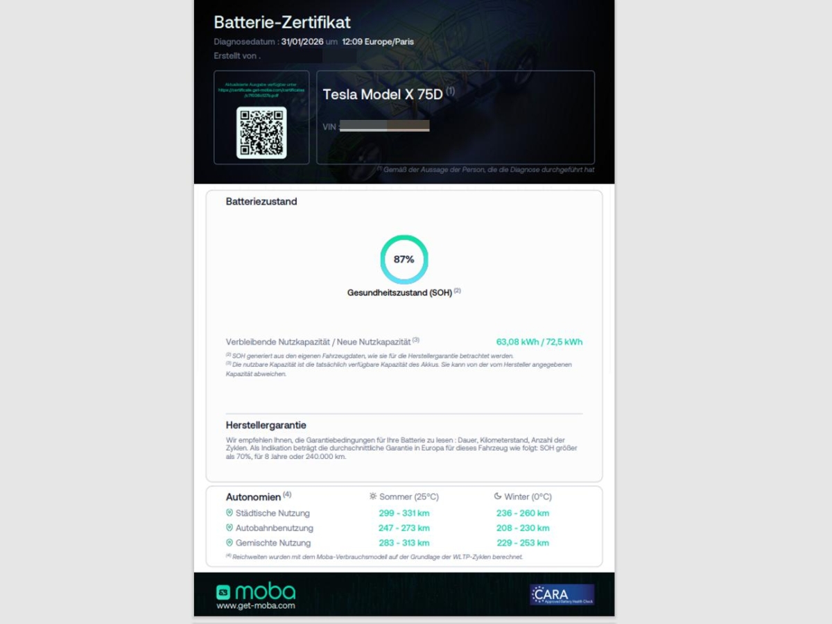 Die Hochvoltbatterie wurde geprüft und ist funktionsfähig. Das Fahrzeug wird mit der HV-Batterie verkauft.
