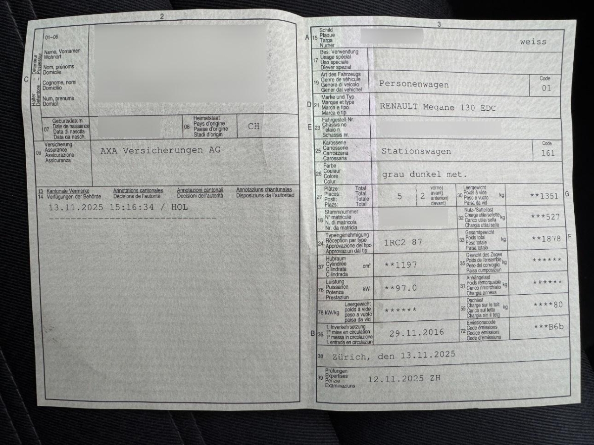 | Fahrzeugausweis | Vorhanden |