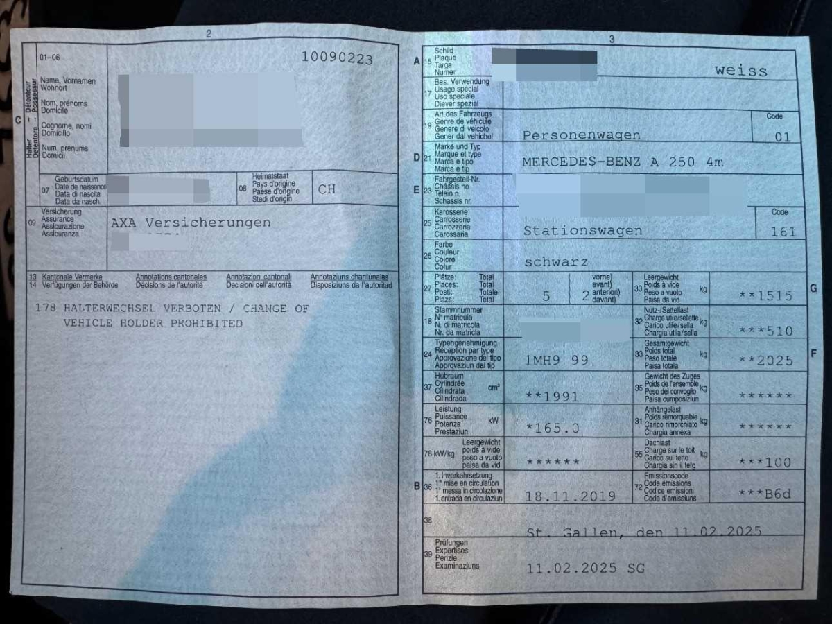 Airbag: Automatische Beifahrerairbag-Abschaltung, Steckdose 12-Volt- vorne, Getriebe: Sequentielles 7-Gang-Getriebe mit Automatikfunktion, Airbag: Knie-Airbag für Fahrer, Einstiegsschienen vorne mit Logo, Klima:Klimatisierungsautomatik THERMOTRONIC, Sitze:Kopfstützen hinten höhenverstellbar, Elektronisches Stabilitäts-Programm (ESP), ECO Start-Stopp-Funktion, Airbag: Seitenairbag für Fahrer und Beifahrer, Ablagen in den Türen, Regensensor für Scheibenwischer vorne, Sitzbelegungserkennung für Beifahrersitz, Bremsbelagverschleiss, Höhenverstellbare Gurten vorne, DYNAMIC SELECT Schalter, Licht:Adaptives Bremslicht, Licht: LED-Tagfahrlicht, Katalysator geregelt, Bremsassistent (BAS), Komfortfahrwerk mit Tieferlegung inklusive Sport-Direktlenkung, Licht:Halogenscheinwerfer, Kommunikationsmodul, Assist:Reifendruck-Kontrollanzeige, Make up-Spiegel links, Zentralverriegelung mit Fernbedienung und automatischer Türverriegelung, Heckscheibenheizung, Dekor: Bordkantenzierstab in Chrom, Antriebsschlupfregelung (ASR), Airbag: Airbag Fahrer und Beifahrer, Allradantrieb permanent, Licht: LED Blinker im Aussenspiegel, Make up-Spiegel rechts, Antiblockiersystem (ABS), Aussenspiegel in Wagenfarbe, Assist:Tempomat mit variabler Geschwindigkeits- begrenzung Limiter, Stossstangen in Wagenfarbe, Sitze:Komfortsitze vorne, Doppelcupholder vorne, Assist: Spurhalteassistent, Dekor: Dachhimmel schwarz, Licht: Nebelschlussleuchte, Heckscheibenwischer, Assist: Notrufsystem, Assist: Aktiver Bremssassistent, Wegfahrsperre elektronisch, Lackierung: Uni-Lackierung, Drittes Bremslicht LED, Scheibenwischer vorne mit Intervall, Sitze:ISOFIX-Befestigungspunkte für Kindersitz an den äusseren Rücksitzen, Sitze:Gurtstraffer vorne, Assist: Transparente Motorhaube, Airbag: Window-Kopfairbags, Türgriffe aussen in Wagenfarbe, KEYLESS GO Start Funktion, Seitenschwellerverkleidung in Wagen- farbe lackiert, Räder:Reifenreparatur-Set mit Kompressor, Sitze: 3-Punkt-Sicherheitsgurte auf allen Plätzen, AMG Leichtmetallräder im 5-Doppelspei- chen Design 18J, Auspuffblende, verchromt, Diamantgrill, Fahrwerk:Direktlenkung mit geschwindigkeits- abhängiger Lenkkraftunterstützung, Lenkrad:Multifunktions-Sportlenkrad in Leder Nappa, Licht: LED High Performance-Scheinwerfer, Polster: Ledernachbildung ARTICO/Stoff zweifarbig, Sitze:Sportsitze vorne