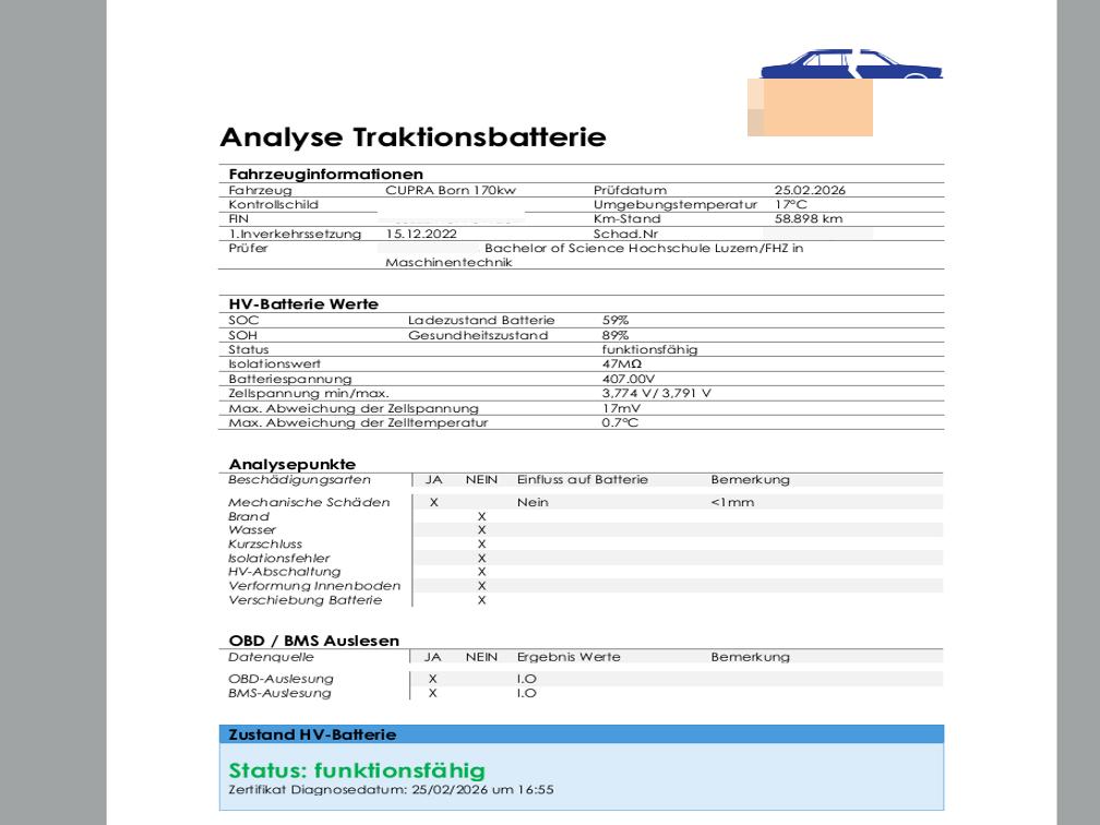 Die HV-Batterie wurde geprüft und ist funktionsfähig.