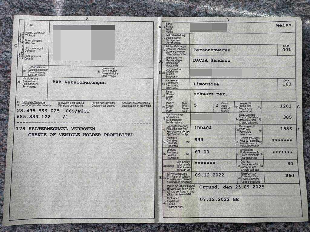 | Fahrzeugausweis | Vorhanden |