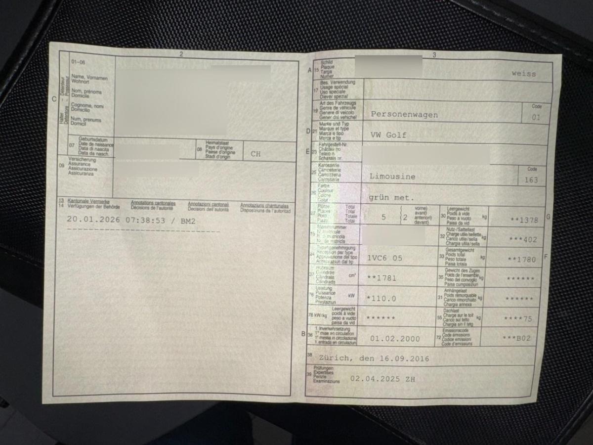 | Fahrzeugausweis | Vorhanden |