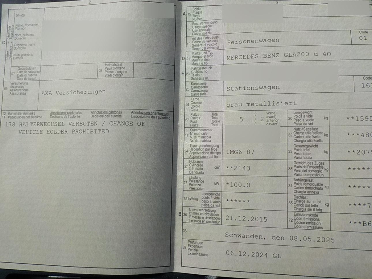 | Fahrzeugausweis | Vorhanden |