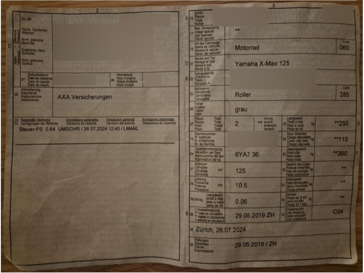 | Fahrzeugausweis | Vorhanden |