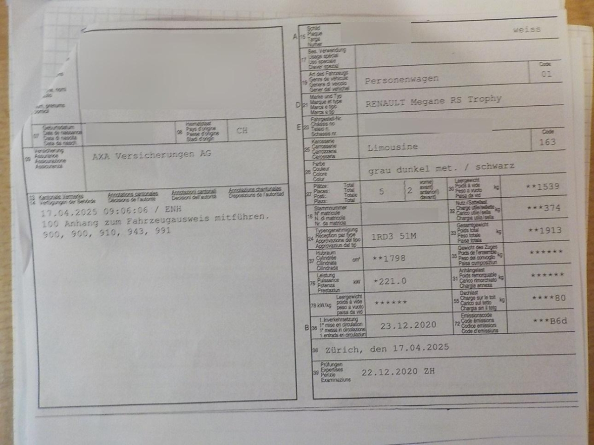 | Fahrzeugausweis | Vorhanden |