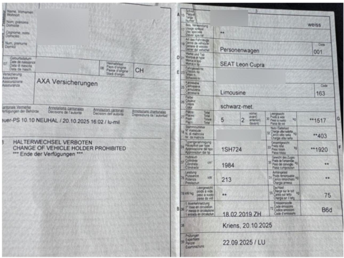 | Fahrzeugausweis | Vorhanden |