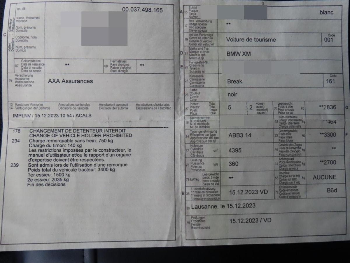 Bremsbelagverschleisssensoren vorne und hinten, Paket: M Aerodynamicpaket, Licht: Innenbeleuchtung beinhaltet: - Leselicht vorne (Fahrer/Beifahrer) - Leselicht hinten (mittig) - Make-Up-Spiegel-Leuchten (Fahrer/Beifahrer) - Handschuhkasten innen - Türausstiegsleuchte vorne (links / rechts) - Fußraumleuchte vorne (links / rechts) - Gepäckraum Lichtband (links / rechts), Ladekabel (Mode 3) für öffentliches Laden - AC-Laden an öffentlichen Ladesäulen für Typ2-Märkte - 11 kW (3-phasig) - Kabellänge: 5m - Aufbewahrung in Tasche im Gepäckraum, Bremsscheiben hinten, innenbelüftet, Licht: LED-Scheinwerfer - adaptiver LED-Scheinwerfer - Abblendlicht (LED-Matrix Technologie) - Fernlicht (LED-Matrix Technologie) - Tagfahrlicht und Fahrtrichtungsanzeiger (in separater Leuchteneinheit) - Leuchtweitenregulierung (automatische Anpassung an die Fahrsituation über vertikalen Schwenkmechanismus und Zu-/Abschalten von LED-Segmenten) - Automatisches Abbiegelicht (Cornering Light) - Standlicht - Heckleuchten - alle Außenleuchten in LED Technologie, Sonnenblenden mit Make-Up-Spiegel beleuchtet, M Sportbremse, schwarz hochglänzend Schwarz hochglänzend lackierte Bremssättel mit M-Schriftzug, Paket: Erweitertes Außenspiegelpaket - elektrisch einstellbar und beheizt, asphärisch - mit elektrischer Anklappfunktion - Bordsteinautomatik - Abblendfunktion Fahrerseite, Klima: Nanofilter, BMW ID Mit der BMW ID wird der Fahrer auf dem Display persönlich begrüßt und alle personalisierten Funktionen stehen zur Verfügung. Bei Verknüpfung der BMW ID mit dem Schlüssel wird die BMW ID bereits mit Entriegelung automatisch aktiviert. Die BMW ID ermöglicht es personalisierte Einstellungen zu speichern und auf andere BMW Fahrzeuge zu übertragen. Für Fahrer im Gastprofil sind Funktionen, die persönliche Daten verarbeiten, nicht verfügbar., Fahrwerk: M Sportdifferential - Verbesserung von Traktion, Agilität, Stabilität sowie Fahrverhalten - Komfort durch harmonisches Übergangsverhalten bei impulsiven Lenkimpulsen - Systemseitige Einstellung des Sperrgrad (Hinterachse), je nach Fahrsituation und Fahrbahnbeschaffenheit zwischen 0 und 100 %, BMW Gestiksteuerung - Spezifisch festgelegte Funktionen können im Erkennungsbereich oberhalb der vorderen Mittelkonsole durch Gestik per Hand gesteuert werden., M Sicherheitsgurte - beinhaltet Sicherheitsgurte schwarz mit Farbcodierung in M Farben für erste und zweite Sitzreihe, Fensterheber, elektrisch - Einklemmschutz und Komfortöffnung/-schließung, Airbag: Frontairbagsystem für Fahrer und Beifahrer, Einstiegsleisten beleuchtet mit Schriftzug, Klima: Klimatisierungsautomatik 4- Zonen - Temperaturregelung für Fahrer, Einstellung von Luftmenge und Luftverteilung Automatikprogramm mit 5 Intensitätsstufen für Fahrer, Beifahrer und Fondpassagiere getrennt - Automatikprogramm mit 5 Intensitätsstufen - Einstellung der Temperaturschichtung für Fahrer und Beifahrer getrennt über MMI - Klimabedienteil vorn mit Vollfarbdisplay - separates Klimabedienfeld für Fondpassagiere in der Mittelkonsole hinten - SYNC-Funktion, Media: DAB+ Tuner, Assist: Akustischer Fussgängerschutz - Künstlich generierter Sound beim elektrischen Fahren zum Schutz anderer Verkehrsteilnehmer (akustische Wahrnehmung). Beim Neu-Start immer aktiv (Default On)., Getränkehalter, temperiert - Getränkehalter beheizt und gekühlt in der Mittelkonsole - Einzeln aktivierbar über Tasten (links und rechts) - Klimafunktion dargestellt über Ambiente Beleuchtung (Blau und Rot), Media: BMW Live Cockpit Professional - rahmenloses Curved Display mit 12,3'' Instrumentendisplay und 14,9" Touch-Display - Augmented View im Touch-Display - Einstellungen in Fahrerprofilen speicherbar, Lenkrad: Schaltwippen am Lenkrad, BMW Niere Iconic Glow - Optisches Exterieur-Highlight: Inszenierung der BMW Niere durch innovative LED-Fasertechnologie, Komfortzugang Beinhaltet folgende Funktionen: - Schlüsselloser Zugang zum Fahrzeug - Welcome Inszenierung bei Annäherung ans Fahrzeug - Automatische Entriegelung bei Annäherung ans Fahrzeug - Automatische Verriegelung beim Entfernen vom Fahrzeug - Berührungsloses Öffnen und Schliessen der Heckklappe Beinhaltet den BMW Digital Key mit folgenden Funktionen: - Ver- und Entriegeln sowie Starten des Fahrzeugs unter Verwendung eines kompatiblen Smartphon., 3-Punkt-Sicherheitsgurte auf allen Plätzen, Bremsscheiben vorne, innenbelüftet, Fussmatten in Velours, Sitze: M Multifunktionssitze für Fahrer und Beifahrer Beinhaltet: - für Fahrer und Beifahrer - beinhaltet die Funktionen der Sitzverstellung, elektrisch mit Memory (Memoryfunktion auch für Beifahrersitz) und Lordosenstütze für Fahrer und Beifahrer - elektrische Einstellung für oberes Lehnensegment, Lehnenbreite und Oberschenkelauflage - platzierte Perforation inklusive XM spezifischem Nahtbild - beleuchtetes M Logo auf der Kopfstütze, Airbag: Kopfairbag 1. und 2. Sitzreihe, Intelligenter Notruf, Teleservices, Assist: Dynamische Stabilitäts Control (DSC) mit erweiterten Umfängen, Condition Based Service, Licht: Heimleuchten, Türen: Soft-Close-Automatik für Türen - Ermöglicht ein bequemes und sicheres Schliessen der Türen ohne viel Kraftaufwand und störende Zuschlaggeräusche. Versehentlich nicht richtig geschlossene Türen werden automatisch zugezogen., Lackierung: Metallic-Lackierung, Assist: Geschwindigkeitsregelung mit Bremsfunktion, Fahrwerk: M xDrive, Assist: Speed Limiter, Dekor: M Interieurleisten Carbon Fibre, Licht: Fernlicht-Assistent - Automatisches Ein- und Ausschalten des Fernlichtes abhängig von der Verkehrssituation - Steuerung über Sensor an der Vorderseite des Innenspiegels, Sonnenschutzverglasung Reduziert bei Sonneneinstrahlung die Aufheizung des Fahrzeuginnenraums. Stärker eingefärbte Verglasung im hinteren Fahrzeugbereich bewirkt eine stärkere Absorption des Sonnenlichtes für diese Flächen., Lenkrad: M Lederlenkrad, Paket: Connected Package Professional, Licht: Dynamische Bremsleuc
