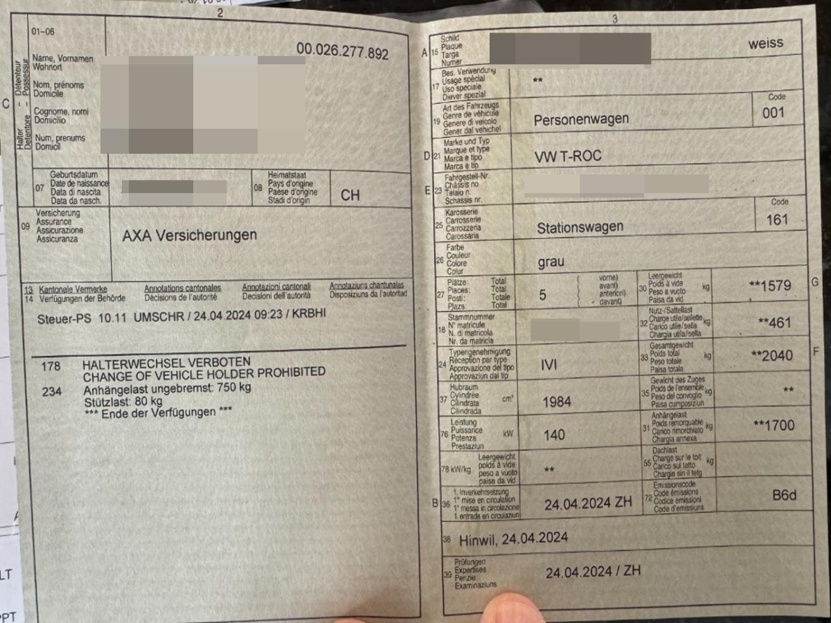 | Fahrzeugausweis | Vorhanden |
