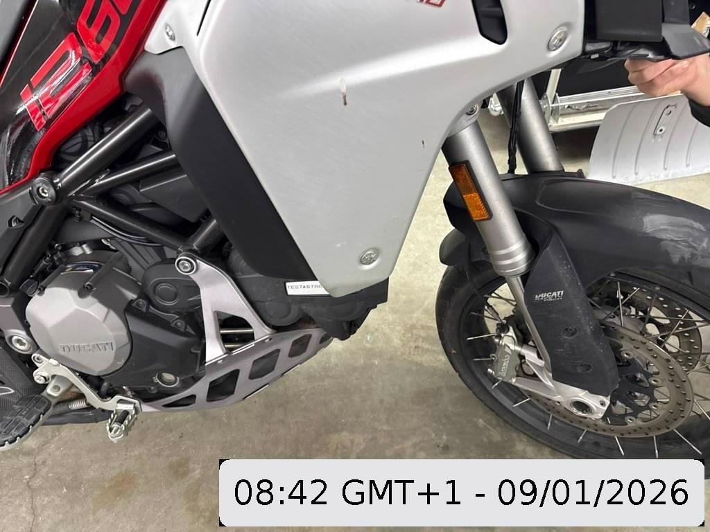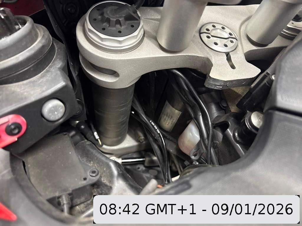 Aussenspiegel links, Front, Fussraster links, Gabelholm, Griff links, Kabelstrang, Kühler, Lenkanschlag, Lenker, Rad vorne, Scheinwerfer, Schutzblech vorne, Seite links, Tank, Verschalungen links, Verschalungen vorne