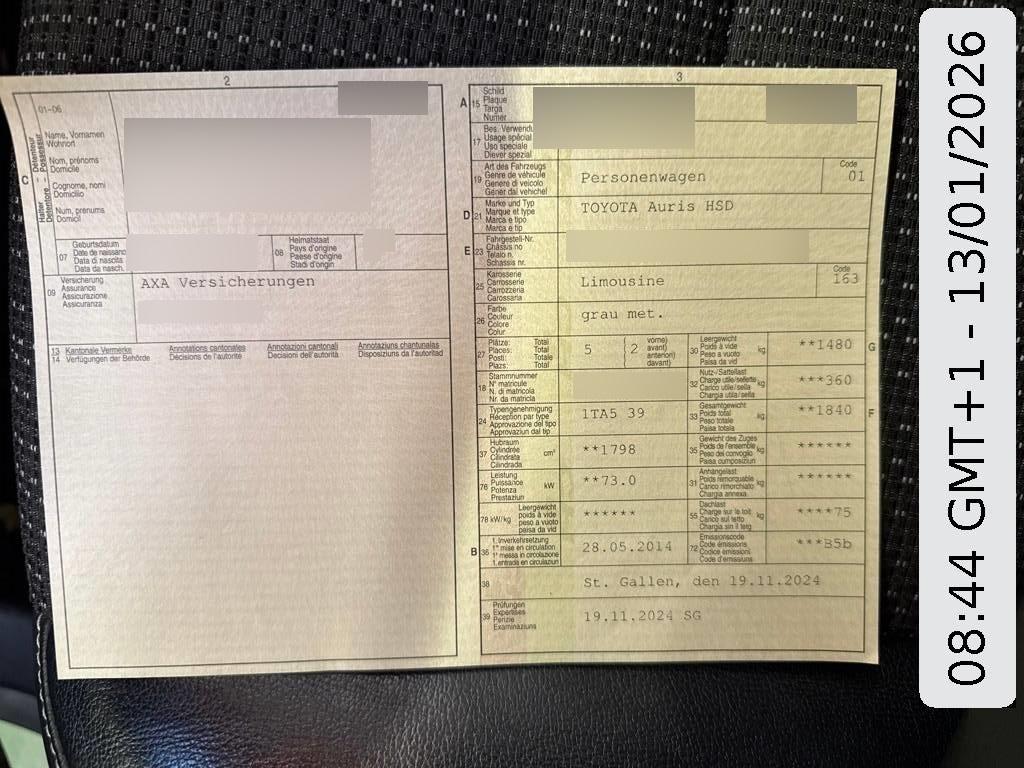 ABS, EBD elektronische Bremskraftverteilung, Bi-Xenon-Scheinwerfer inkl. adaptivem Kurvenlicht, Stabilitäts- und Traktionskontrolle (VSC und TRC), Aussenspiegel rechts und links beheizt, elektrisch verstell- / und einklappbar, Regen- und Dämmerungssensor, Mittelarmlehne hinten, Airbag: Knie-Airbag für Fahrer, Assist: Rückfahrkamera, Teilledersitze, Airbag: Window-Kopfairbags, Nebelscheinwerfer mit Chromeinfassung, Smart Entry, Multifunktionsanzeige, Assist: Tempomat, Elektrische Fensterheber hinten, Seitenaufprall-Schutzsystem, Parksensoren vorne und hinten lackiert, Heckscheibenheizung, ISOFIX Kindersitzvorrichtung, Licht: LED-Tagfahrlicht, Stossstangen, Aussenspiegel und Türgriff in Wagenfarbe, Media: Digitaler Radioempfang (DAB/DAB+), Ablagefach im Kofferraum, LED Blinker im Aussenspiegel, Servolenkung, Getönte Scheiben, Leichtmetallräder im 5-Doppelspeichen - Design 17J, Sitze: Rücksitzlehne geteilt abklappbar, Licht: Nebelschlussleuchte, 3 Kopfstützen hinten, Ablagen in den Türen, Airbag: Airbag Beifahrer deaktivierbar, Drittes Bremslicht LED, Sitze mit Schleudertrauma-Schutzsystem, Radio/CD-Player mit MP3 und Fernbedienung am Lenkrad, Laderaumabdeckung, Licht: Umgebungsausleuchtung (Follow me home), Ausstiegsleuchten in den Türen, Wegfahrsperre elektronisch, Scheibenwischer vorne mit Intervall, 12-Volt-Steckdose hinten, Gurtkontrolle, Lackierung: Uni-Lackierung, Bodenabdeckung im Laderaum, 12-Volt-Steckdose vorne, Räder: TPMS Reifendrucküberwachungssystem, Assist: Berganfahrhilfe (Hill Assist Control - HAC), Drehzahlmesser, Mittelarmlehne aus Leder, Media: USB+AUX-Anschluss, Fussraumbeleuchtung vorne, Assist: Parksensoren hinten lackiert, UV-absorbierende Verglasung, Getriebe: Stufenloser Automat, Pollenfilter (Staubfilter), Kühlergrill verchromt, Leuchtweitenregulierung von innen, Media: 9 Lautsprecher, Start-/Stop-Knopf, Start-/Stop-Automatik, Seitenfenster-Zierleisten verchromt, Kopfstützen vorne höhenverstellbar, Cupholder vorne und hinten, 4 Scheibenbremsen, Katalysator geregelt, Ablagefach im Kofferraumboden, Digital Uhr, Lenkrad: Lenkrad längs- und höhenverstellbar, Tankdeckel-Entriegelung von innen, 3-Punkt-Sicherheitsgurte auf allen Plätzen, Vordersitze höhenverstellbar, Kindersicherung an den hinteren Türen, Einstiegsschienen, Licht- und Regensensor, Media: Bluetooth Freisprecheinrichtung, Unteres Kühlergitter verchromt, Kartentaschen an den Rückenlehnen, Media: Multimedia Audiosystem Toyota Touch 2, Kühlergrill mit Chromzierrand, Haltegriffe für Beifahrer und Fondpassagiere, Aussentemperaturanzeige, Räder: Reifenreparatur-Set (Tire Fit), Tageskilometerzähler, Wassertemperaturanzeige, Innenspiegel automatisch abblendbar, Zentralverriegelung mit Fernbedienung, Sitze: Vordersitze heizbar, Farbmonitor, Sonnenblende Fahrer und Beifahrerseite mit beleuchtetem Spiegel, Wärmeschutzverglasung, Licht: Fernlicht-Assistent, 12 Volt-Steckdose im Laderaum, Bremsassistent (BAS), Kopfstützen hinten höhenverstellbar, Leder-Multifunktionslenkrad im 3-Speichen-Design und Telefon-Bedien., Assist: Parkassistent, Sitze: Kreuzstütze für Fahrersitz elektrisch verstellbar, Klima: 2-Zonen-Klimaautomatik, Gurtstraffer mit Gurtkraftbegrenzer vorne, Airbag: Seitenairbag für Fahrer und Beifahrer, Frontspoiler, Airbag: Airbag Fahrer und Beifahrer, Licht: Halogenscheinwerfer, Licht: LED Heckleuchten, Fensterheber elektrisch vorne mit automatischer Hoch-und Tieflaufsteuerung, Info-Display