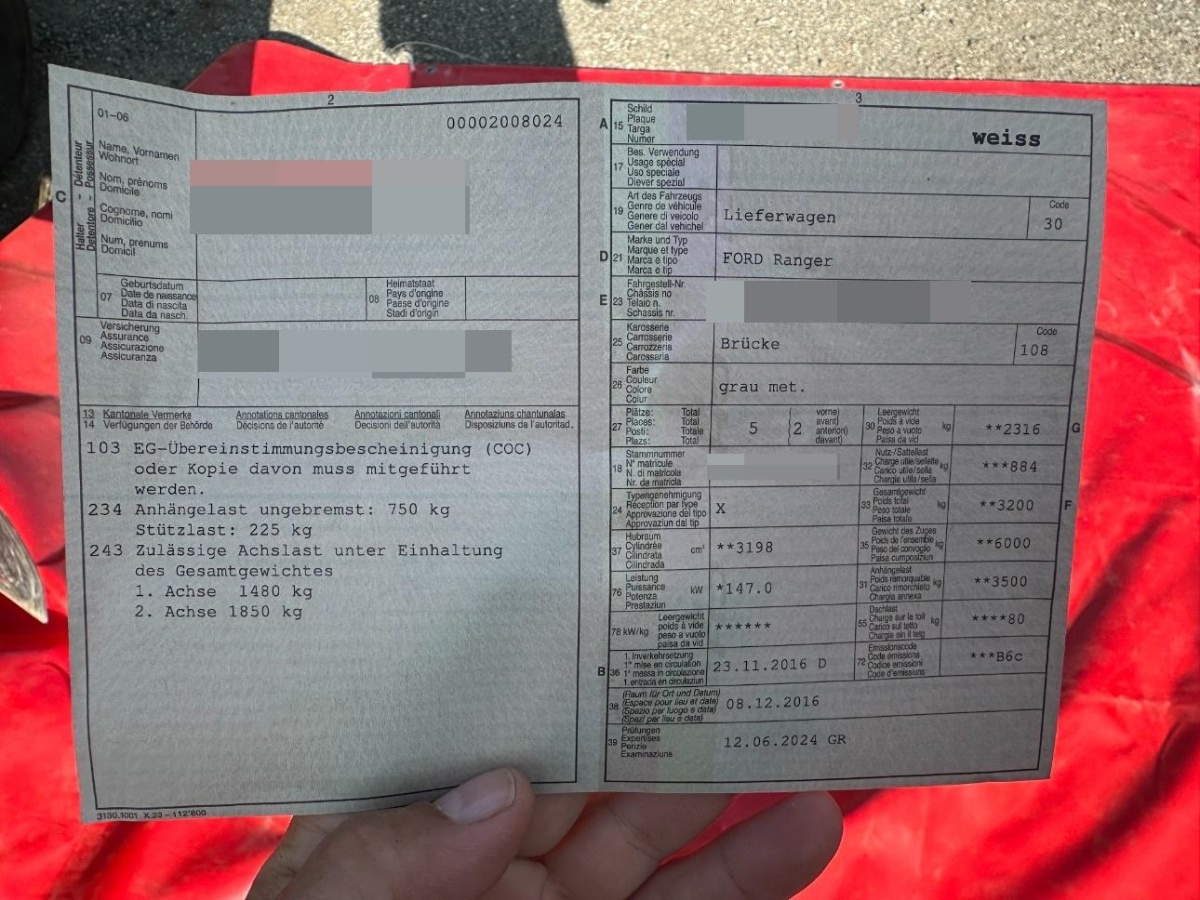 Servolenkung, Laderaumschutzwanne, Sonnenblende Fahrer und Beifahrerseite mit beleuchtetem Spiegel, Airbag: Seitenairbag für Fahrer und Beifahrer, Ohne Sportbügel verchromt, Fahrersitz 4-fach manuell verstellbar, Heckscheibenheizung, 3-Punkt-Sicherheitsgurte auf allen Plätzen, 2. Schlüssel mit Funkfernbedienung, Brillenfach, Türgriffe aussen in Wagenfarbe, Elektronisches Stabilitäts-Programm (ESP), Getriebe: 6-Stufen-Automat, Leseleuchten vorne, Trittbrett hinten, Aussentemperaturanzeige, Mittelkonsole mit Ablagefach, Teppichfussmatten mit Logo, Airbag: Knie-Airbag für Fahrer, Lackierung: Uni-Lackierung, Assist: Rückfahrkamera, Aussenspiegel rechts und links beheizt, elektrisch verstell- / und einklappbar, Sitze: Vordersitze heizbar, Teppichboden vorne und hinten, Partikelfilter und Oxydationskatalysator, Steckdose 12V, Pollenfilter (Staubfilter), Assist: Berganfahrhilfe, Innenspiegel automatisch abblendbar, C-Channel Befestigungssystem, Innenleuchten LED, Sitze: Fahrersitz elektrisch verstellbar, Assist: Park Distance Control hinten, Räder: Reserverad mit Alufelge, Licht: Tagfahrlicht, Überrollschutzsystem, Polster: Teilleder-Ausstattung, Licht: Nebelscheinwerfer, Airbag: Window-Kopfairbags, Zentrale Doppelverriegelung, ABS und TCS, Räder: Reifendruckkontrollsystem, Navigationssystem SYNC 3.0, Radio mit Dual Tuner, CD, farbiges TFT Multifunktionsdisplay 8', USB, Lenkradbedienung, Kühlergrilleinfassungen, Sitze: 3er-Sitzbank hinten, Blinker in Aussenspiegel, 12 Volt-Steckdose im Laderaum, Nebelschlussleuchte, Stossstangen in Wagenfarbe, Lenkrad: Lederlenkrad, Bordcomputer, Wegfahrsperre elektronisch, Gurtstraffer vorne, Licht: Licht- und Regensensor, Airbag: Airbag Fahrer und Beifahrer, Elektrische Fensterheber vorne + hinten, Kotschutzlappen vorne und hinten, Steckdose 12V, 3x, Abgedunkelte Seiten- und Heckscheibe, Frontscheibenheizung, Klima: 2-Zonen-Klimaautomatik, Assist: Tempomat mit Geschwindigkeitsbegrenzer, Trittbrett seitlich, Allradantrieb zuschaltbar, Türverkleidung in Leder, Sitze: Kartentasche an der Rückenlehne, ISOFIX Kindersitzvorrichtung, Ablagefach im Dachbereich, Dachreling, Türgriffe innen verchromt, Heavy Duty, Räder: 4 Leichtmetallfelgen 8 x 18J mit Pneu 265/60 R 18, Schalthebelknauf in Leder