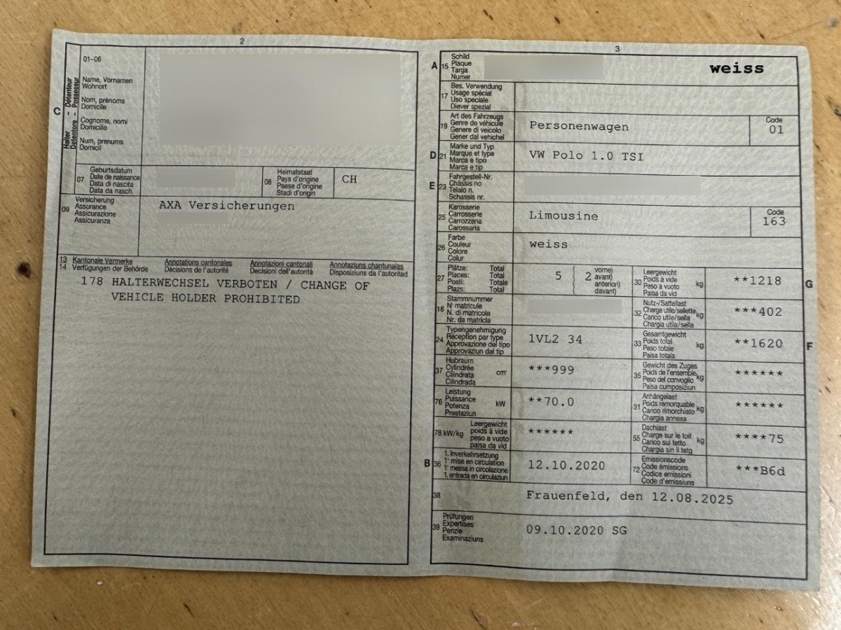| Fahrzeugausweis | Vorhanden |