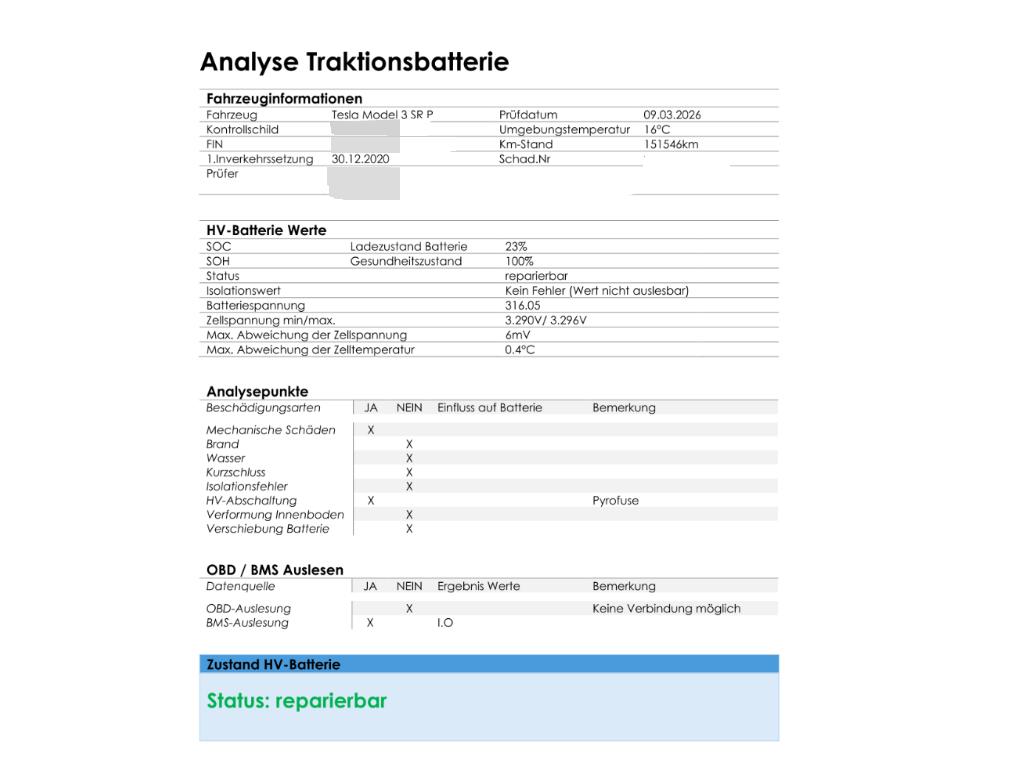 Die Hochvoltbatterie wurde geprüft und ist reparierbar. Das Fahrzeug wird mit der HV-Batterie verkauft. Die Pyrofuse sowie der Kühlwasseranschluss an der HV-Batterie muss durch einen Fachbetrieb gewechselt werden.