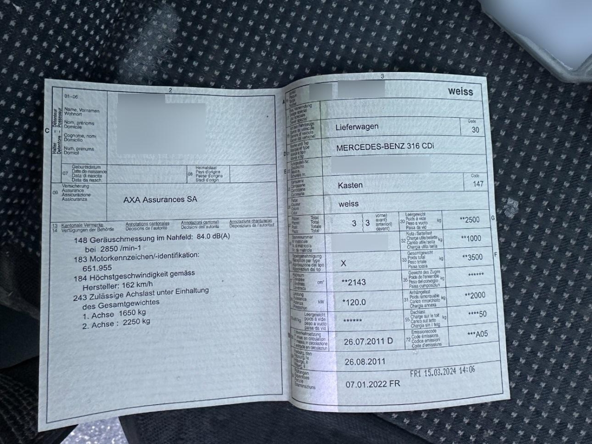 Servolenkung, Lenkrad: Lenkrad längs- und höhenverstellbar, Laderaumtrennwand, Antiblockiersystem (ABS), Verkleidung des Laderaums bis Höhe Brüstungsgurt (Hartfaser), Airbag: Airbag Fahrerseite, Radio Sound 5, Getönte Scheiben, Kotschutzlappen hinten, Aschenbecher und Zigarettenanzünder, Komfort-Fahrersitz, Elektrische Fensterheber vorne, Automatische Fahrlichtabschaltung auf Standlicht, Polster: Stoff-Ausstattung, Lackierung: Uni-Lackierung, Abschliessbares Handschuhfach, Holzfussboden im Laderaum, Elektronisches Stabilitäts-Programm ADAPTIVE ESP, Zentralverriegelung mit Fernbedienung, Reserverad, Antriebsschlupfregelung (ASR), Radiovorbereitung, Antenne, Entstörung und 2 LS, Innenbeleuchtung im Laderaum, Tageskilometerzähler, Elektrik für Anhängersteckdose, Kotschutzlappen vorne, Ablagefach über der Frontscheibe, Türen: Schiebetüre rechts, Leuchtweitenregulierung von innen, Stahlräder 16J, Aussenspiegel rechts und links beheizt und elektrisch verstellbar, asphärisch gewölbtes Spiegelglas, Bremsassistent (BAS), Getriebe: 6-Gang-Schaltgetriebe, Zusatzheizung, Digital Uhr, Drittes Bremslicht, Beifahrer Doppelsitzbank, Wartungsintervall-Anzeige, Ersatzradhalterung, Drehzahlmesser, Cupholder vorne, Flügeltüren hinten 180°, verblecht, Getriebe: Partikelfilter und Oxydationskatalysator, Hochdach, Leseleuchten vorne, Gurtstraffer vorne, Wegfahrsperre elektronisch